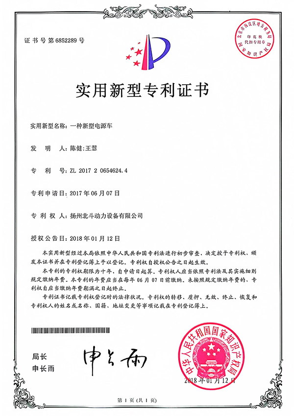 电源车专利证书